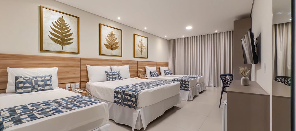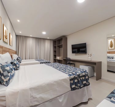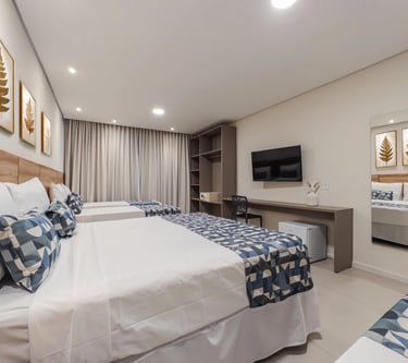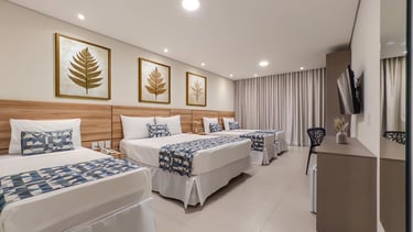 Perfeita para famílias que buscam conforto, espaço e privacidade, a categoria Family do Bosque do Porto Praia Hotel oferece um ambiente moderno, amplo e acolhedor. O quarto conta com camas confortáveis, decoração sofisticada em tons neutros e detalhes em madeira que criam uma atmosfera elegante e relaxante.